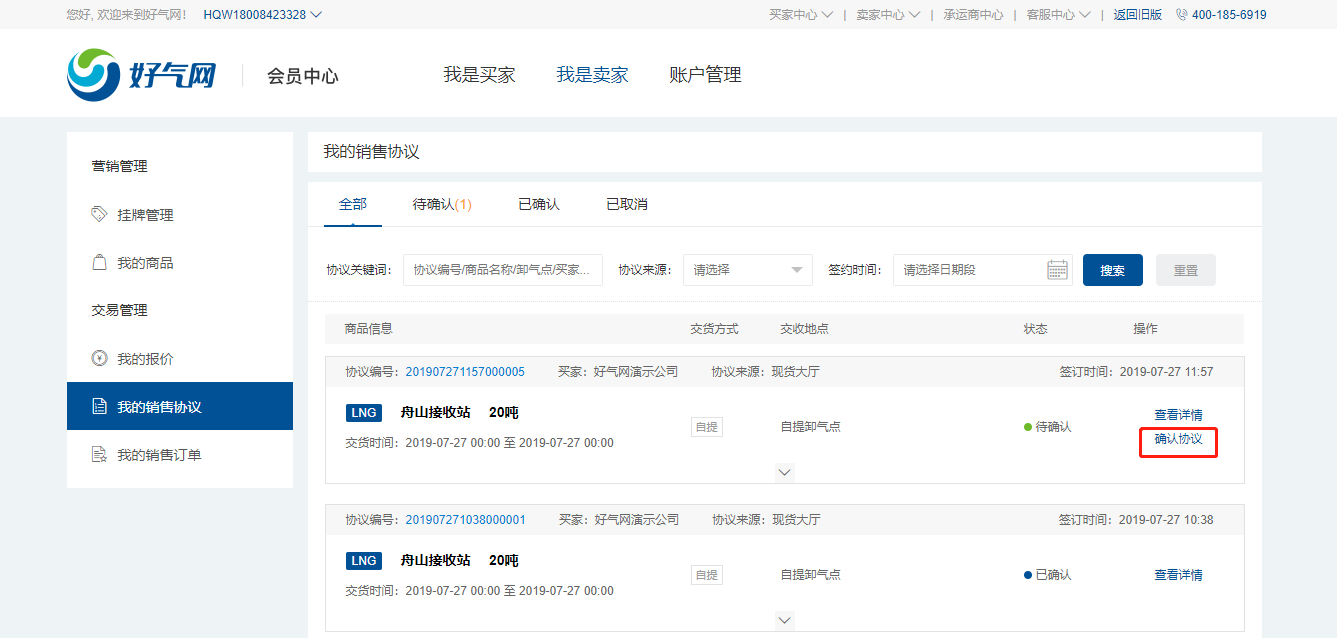 确认购销协议。您挂牌后,买家在【现货大厅】可浏览、采购您的挂牌商品。一旦有买家采购,系统将向您下发通知,您需要在【我是卖家】-【我的销售协议】中及时确认购销协议。